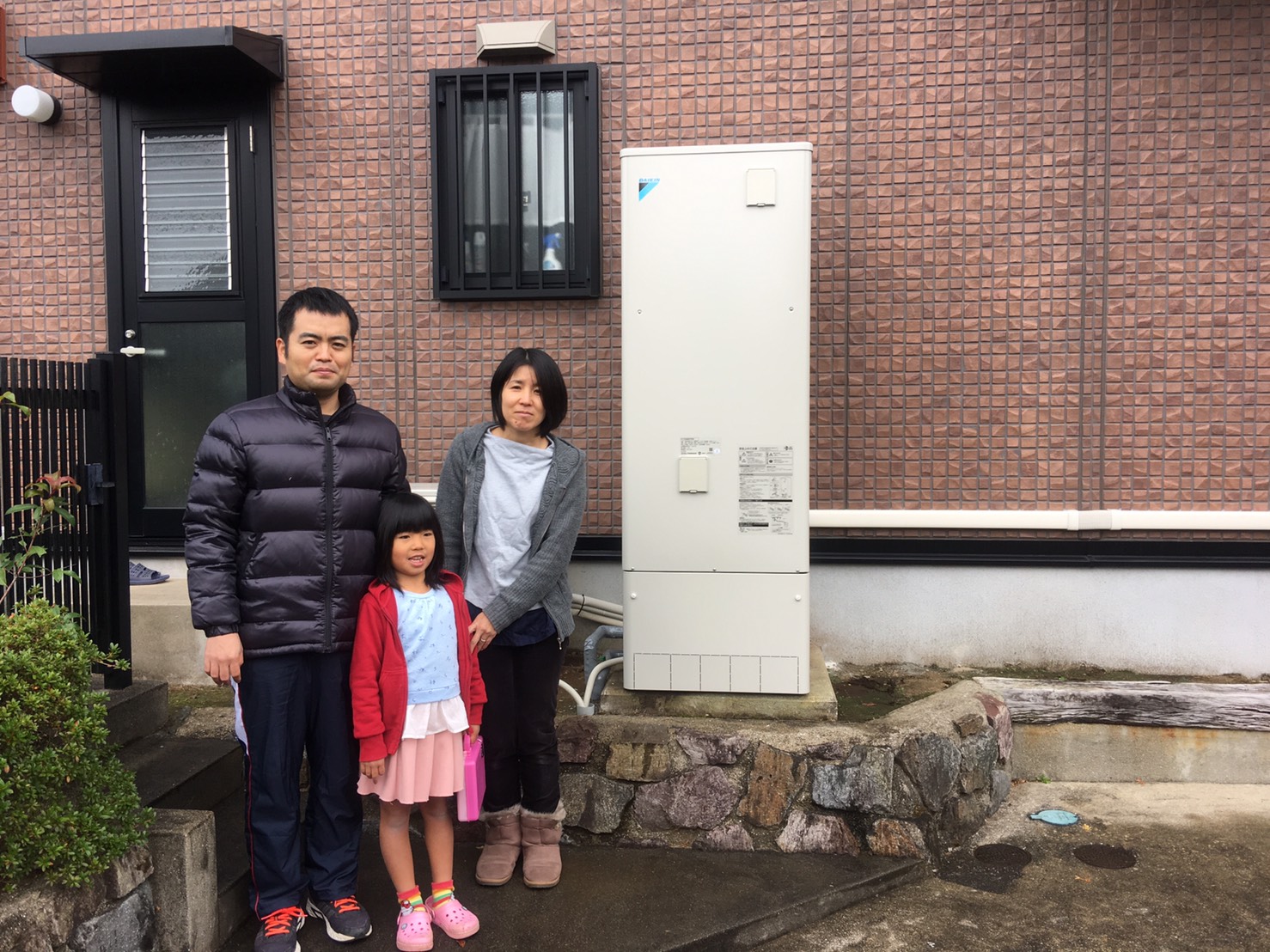 3.お客様担当者より: この度は、追い焚き機能が付いたフルオートタイプのエコキュートとIHクッキングヒーターも60cmタイプから広めの75cmタイプをお勧めさせて頂きました。ご夫婦と息子さま娘様の4名の明るいご家族でお客様より笑顔を頂けました事をとても嬉しく思います。又、せっかくの日曜日に工事をさせて頂きまして有難うございました。これからも末永いお付き合いを宜しくお願い致します。